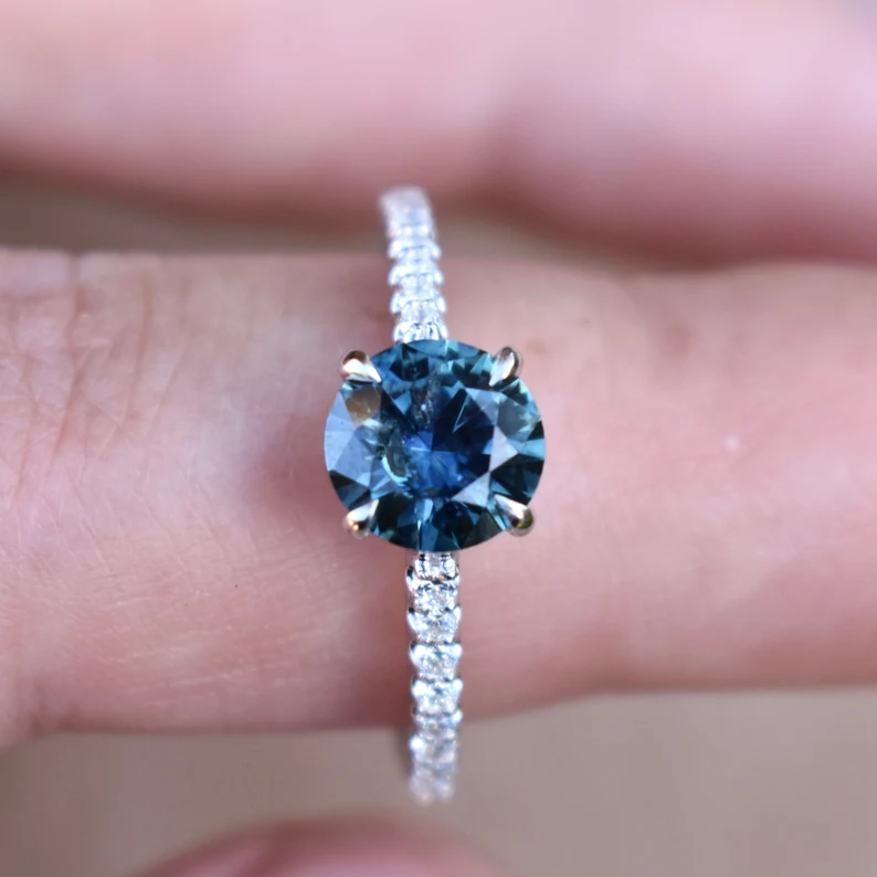 Teal Blue Montana Sapphire Solitaire Engagement Ring featuring a 1.3 - 1.4 ct genuine sapphire and 20 diamonds, set in solid 14K gold. GIA & BIS Hallmarked.