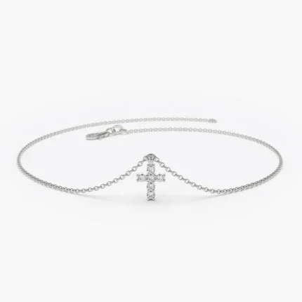 The 14K Solid Gold Lab-Grown Diamond Cross Charm Bracelet features VS clarity, F color diamonds and is available in white, rose, and yellow gold. Certified with BIS Hallmarked and IGI, with shipping in 10-12 business days. Live chat and video call customer support available.