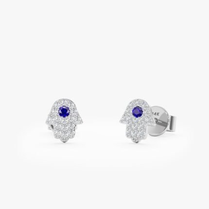 Elevate your style with these exquisite Natural Diamond Sapphire Hamsa Studs. Handcrafted in solid gold, they feature sparkling diamonds and a stunning blue sapphire, symbolizing protection and elegance.