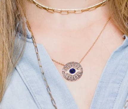 A bold 18k solid gold necklace featuring a rainbow of sapphires and diamonds in an evil eye design, offering a vibrant and protective symbol of elegance.