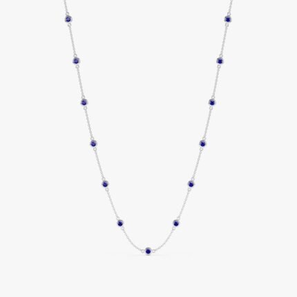 A stunning 14K solid gold necklace featuring multi blue sapphires set in a station design, offering a vibrant and elegant touch to any outfit.