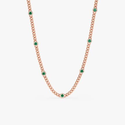 A luxurious 14K solid gold Cuban chain necklace featuring emerald stations, offering a bold and elegant design perfect for any special occasion.