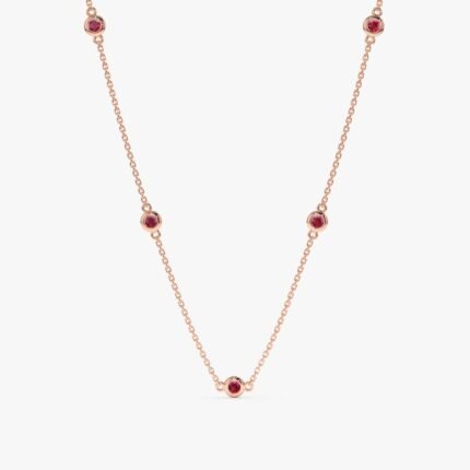 A delicate 14K solid gold necklace featuring vibrant pink sapphire stations, offering a timeless and elegant design perfect for any occasion.