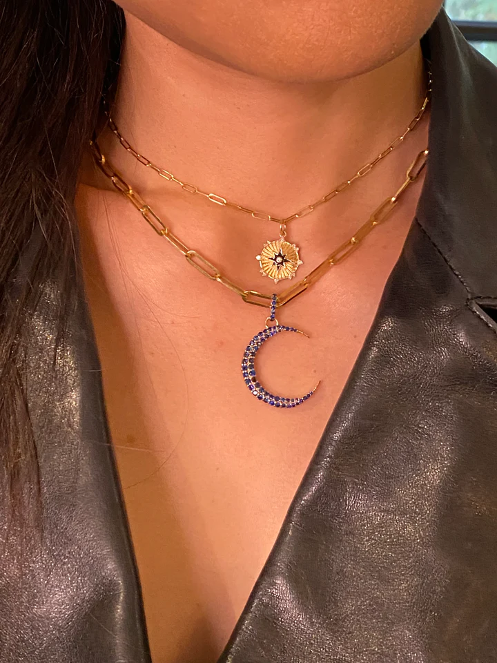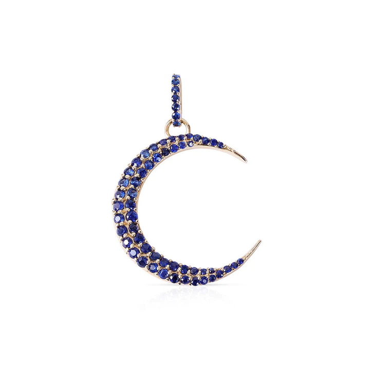 A beautiful 14K solid gold crescent moon pendant featuring vibrant sapphires, offering a celestial and elegant design perfect for any occasion.