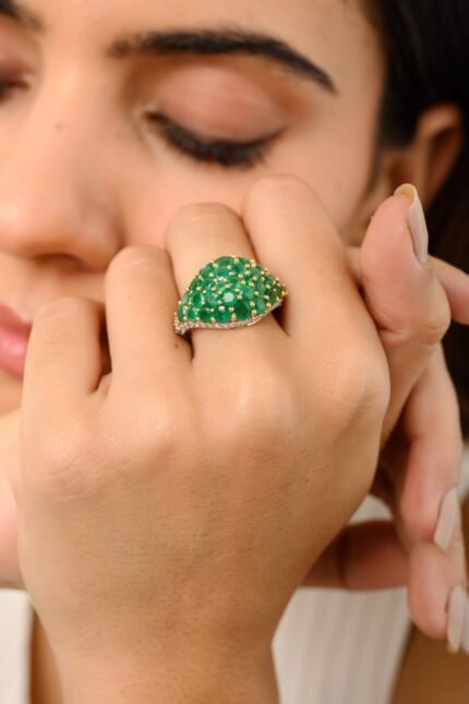 Luxurious 14K solid gold statement ring featuring a 1.13 carat cluster of diamonds and emeralds—crafted for bold elegance and radiant charm.