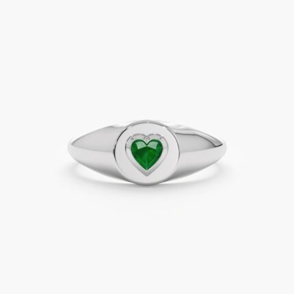 14K Solid Gold Emerald And Diamond Heart Signet Ring