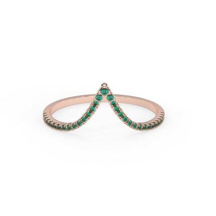 Elegant 18k solid gold V-shape wedding band with natural emeralds, combining a modern design with vibrant color for a timeless and meaningful piece.