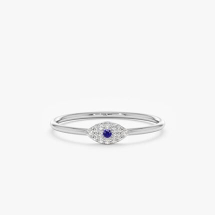 Stylish 14K solid gold evil eye ring featuring a single sapphire and natural diamonds—a unique blend of protection and elegance.