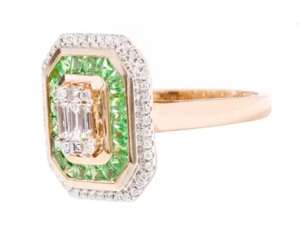 A striking 14K solid gold ring featuring 1.22 carats of invisible-set diamonds and a tsavorite cluster, offering a bold and elegant design.