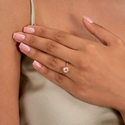 Elegant 18k solid gold ring featuring a hexagon-shaped rose quartz, offering a soft pink hue and a touch of timeless sophistication.