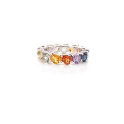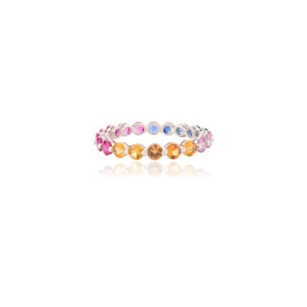 Vibrant 14K solid gold eternity band featuring a full circle of multi-colored sapphires. Perfect for stacking or wearing solo.