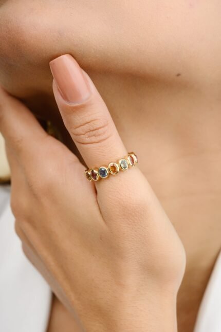Elegant 14K solid gold eternity band featuring vibrant multi sapphires, perfect for adding colorful sparkle and timeless charm to any look.