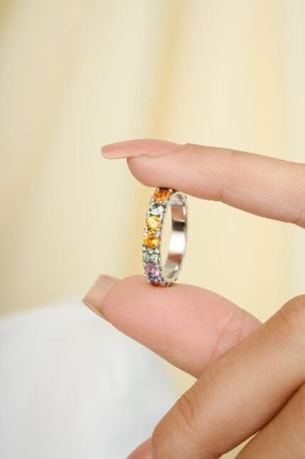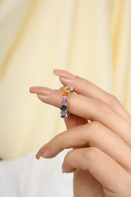Elegant 14K solid gold half eternity band featuring vibrant multi sapphires, perfect for adding a splash of color and sparkle to any look.