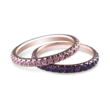 A vibrant 18k solid gold eternity band featuring pink sapphires, offering a timeless and elegant design symbolizing everlasting love.