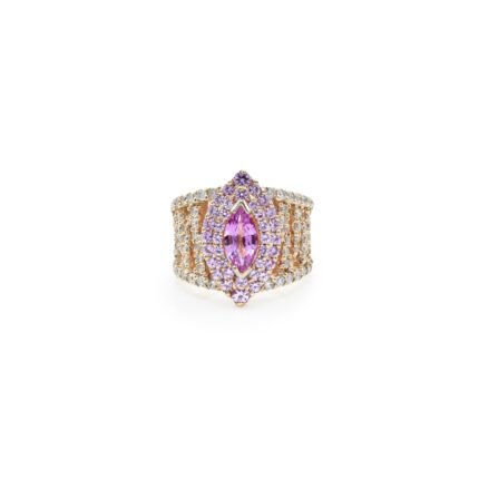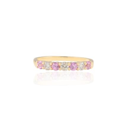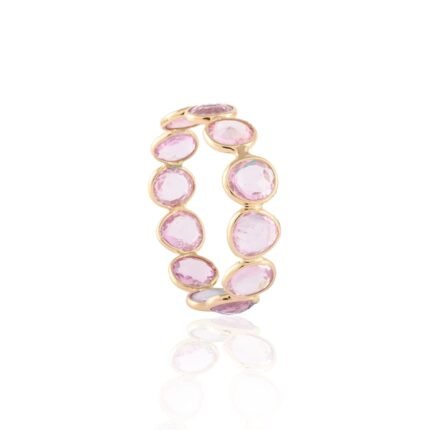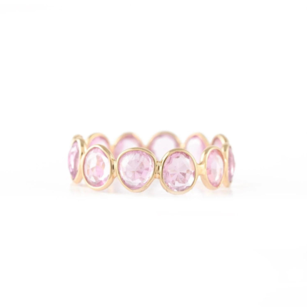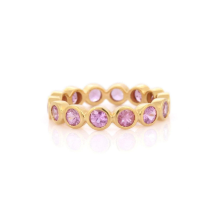 A vibrant 14K solid gold eternity band featuring pink sapphires, offering a timeless and elegant design symbolizing everlasting love.