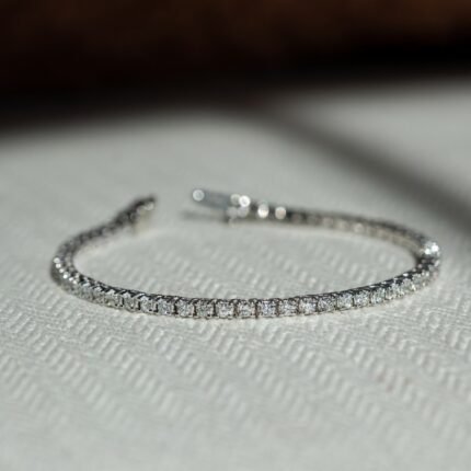 This 14K solid white gold tennis bracelet features brilliant moissanite diamonds in a sleek design—offering classic charm and enduring sophistication.
