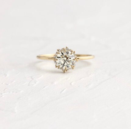 The Round Cut 1 ct Moissanite Diamond Pave Setting Engagement Ring in 14K solid gold offers VVS1 clarity, D color, and an elegant pave setting for added sparkle.