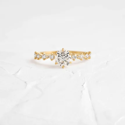 The Wavelet Ring showcases a 0.9ct round-cut moissanite diamond in a fluid, sculptural design — blending classic sparkle with modern elegance.