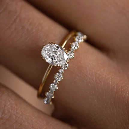 1.5 ct oval-cut moissanite diamond ring with pavé band, set in 14K solid gold. Stunning D color, VVS1 clarity. BIS & GRA certified for authenticity.