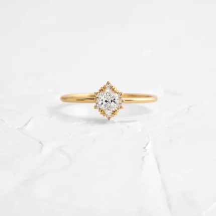 This 14K solid gold ring features a 1.5ct oval cut moissanite surrounded by a cluster of accents—offering radiant brilliance and graceful sophistication.