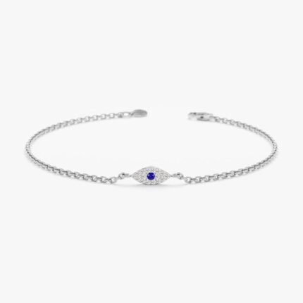 A striking 14K solid gold bracelet featuring a single sapphire and diamond eye design, offering a blend of elegance and protection in a chic, modern piece.
