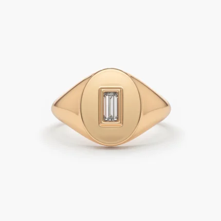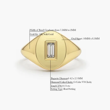 Bold 14K gold signet ring with bezel-set baguette diamond (4.2x2.3mm). GH color, VS-SI clarity. BIS Hallmarked & GIA certified.