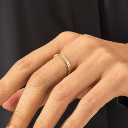 18k solid gold stacking ring with 0.14 ct natural diamonds (GH color, VS-SI clarity). Elegant curved design. GIA & BIS certified.