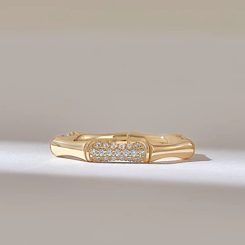 Pave Natural Diamond Bamboo Ring | 18K Solid Gold Bone Ring | Unique Thick Stacking Ring