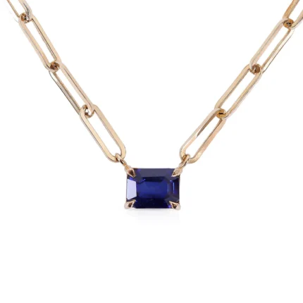 A sleek 14K solid gold paperclip necklace featuring vibrant gemstones, offering a modern and elegant design perfect for layering or wearing alone.