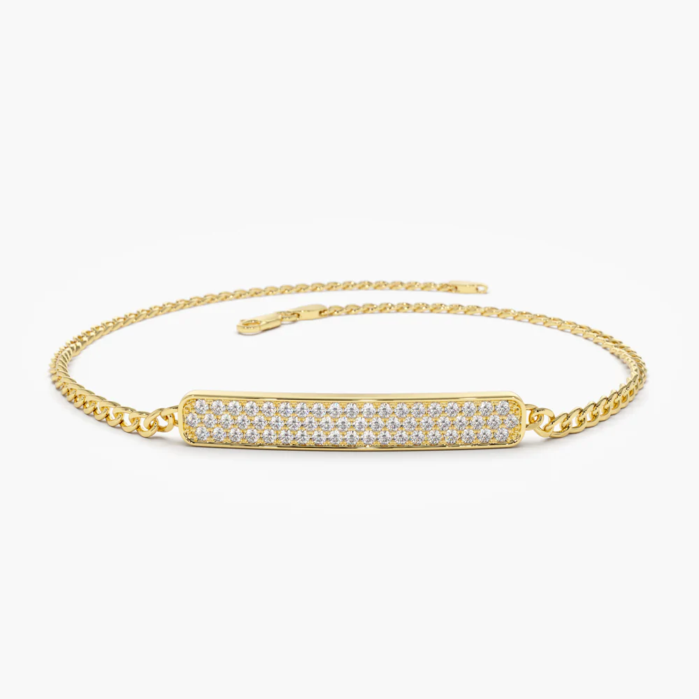 The 14K Gold 3MM Curb Link Diamond Pave Bracelet features 58 round diamonds with a total of 0.39 ct. The bar measures 26mm in length and 4mm in width. Available in white, rose, or yellow gold, the bracelet is BIS Hallmarked and ships in 10-12 business days. Customer support is available via live chats and video calls.