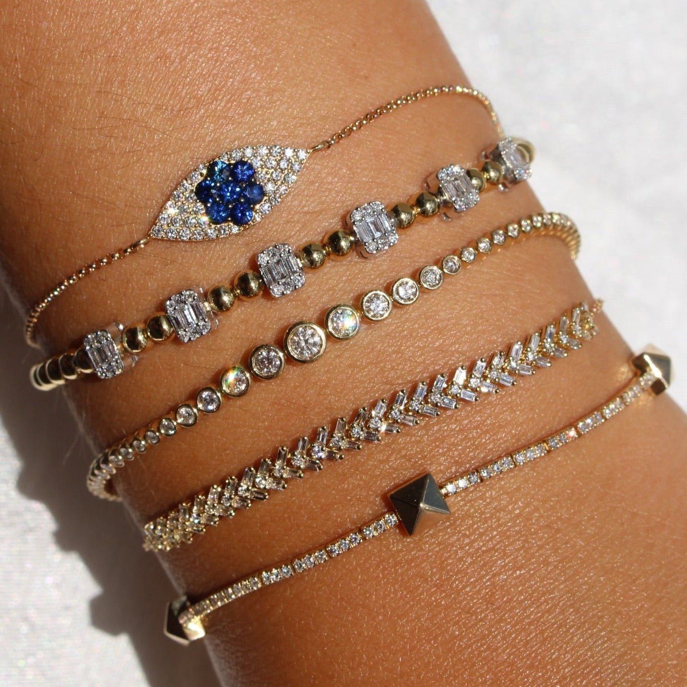- Design: Three evil eye motifs with diamond accents on an adjustable hand bracelet.