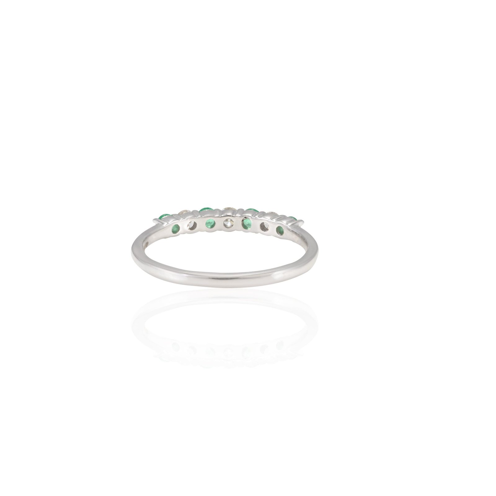 Weighing 1.779 grams, this half eternity band offers a lightweight yet luxurious feel, making it ideal for everyday wear or special occasions. The shank, measuring 1.4 mm in width, provides a delicate and refined appearance that sits gracefully on the finger. The elegant design ensures that the emeralds and diamonds remain the focal points, allowing their beauty to shine through.