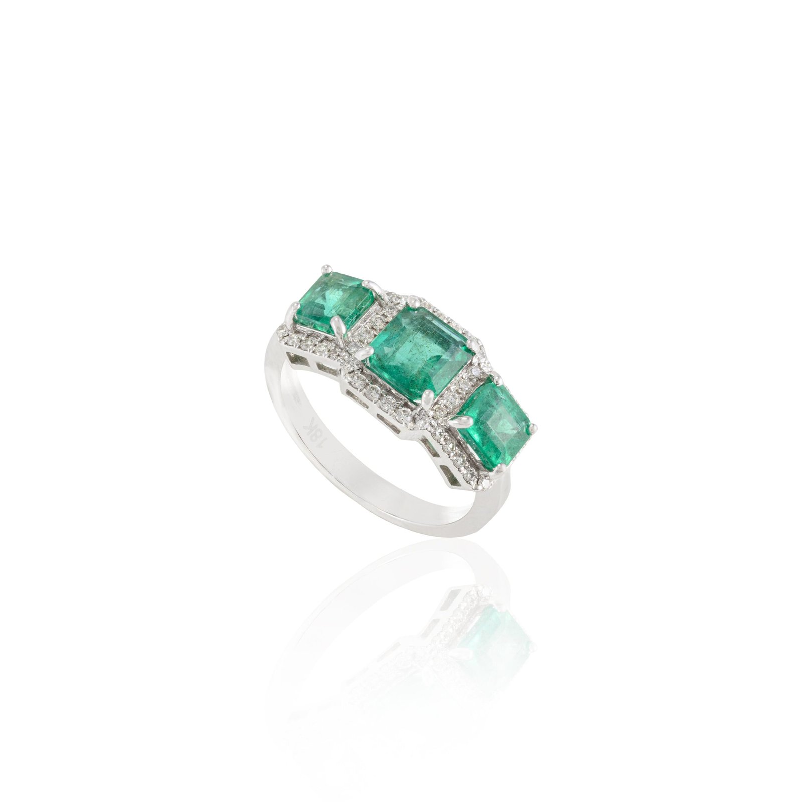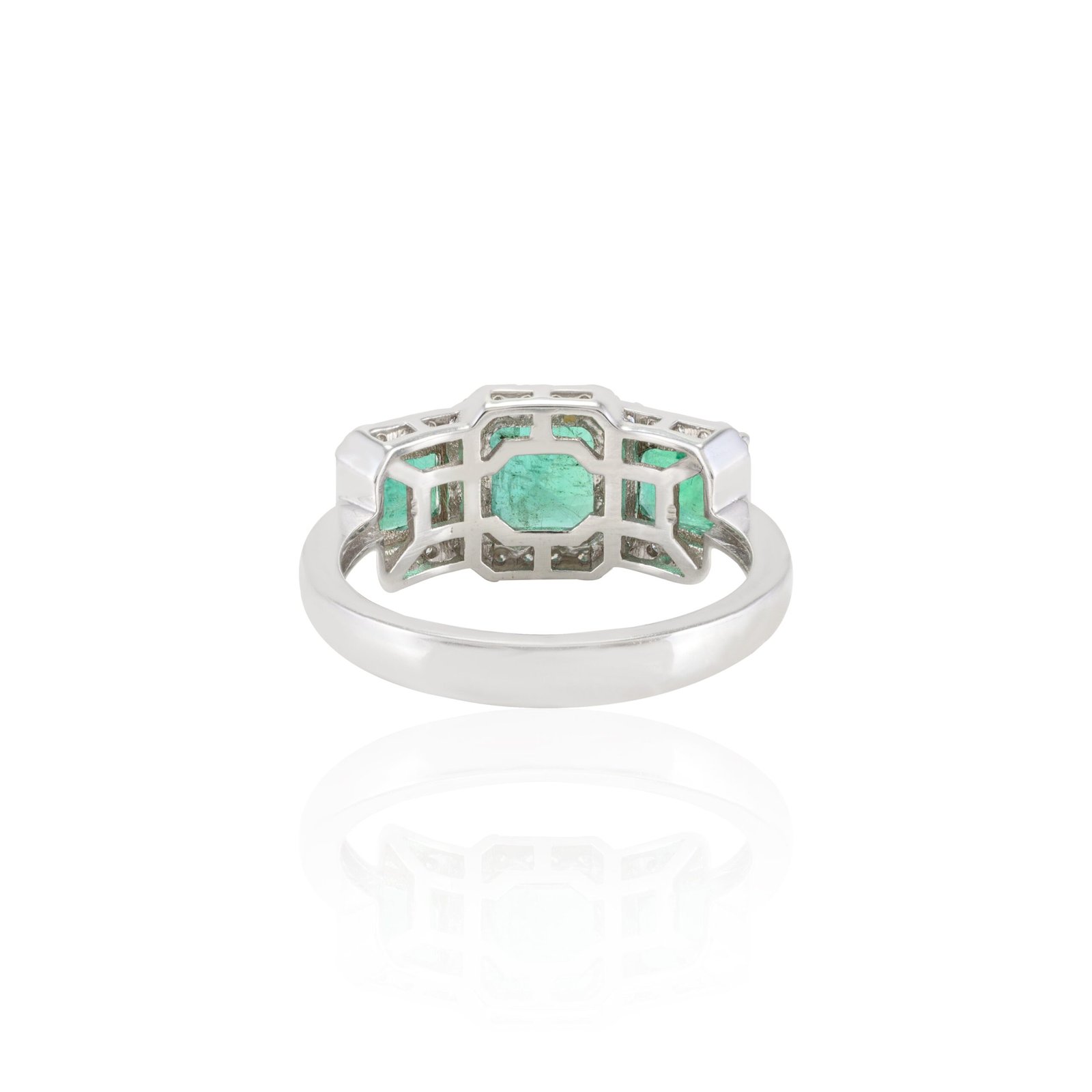 The 14K Solid Gold Emerald Diamond Three Stone Ring is an exquisite piece that combines the vibrant allure of emeralds with the timeless elegance of diamonds. Crafted from 14K solid gold, this ring features three stunning square-shaped emeralds, with a total gemstone weight of 2.16 carats. The emeralds, measuring 4.5 x 5.8 mm and 4.7 x 4.7 mm, display a rich green hue that is beautifully complemented by the cool tones of the white gold, creating a harmonious and captivating look.