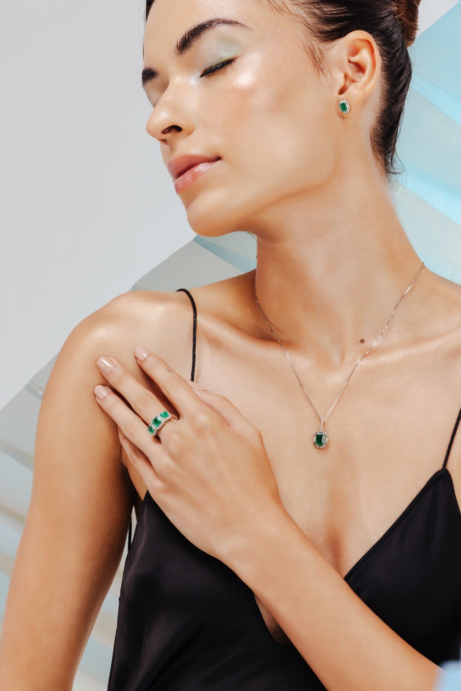 Celebrate the beauty and sophistication of emeralds and diamonds with the 14K Gold Emerald Diamond Three Stone Ring. This ring is a testament to the artistry of fine jewelry, offering a perfect blend of classic elegance and modern luxury. Embrace the grace and allure that this stunning ring brings to your jewelry collection, making it a treasured piece for years to come.