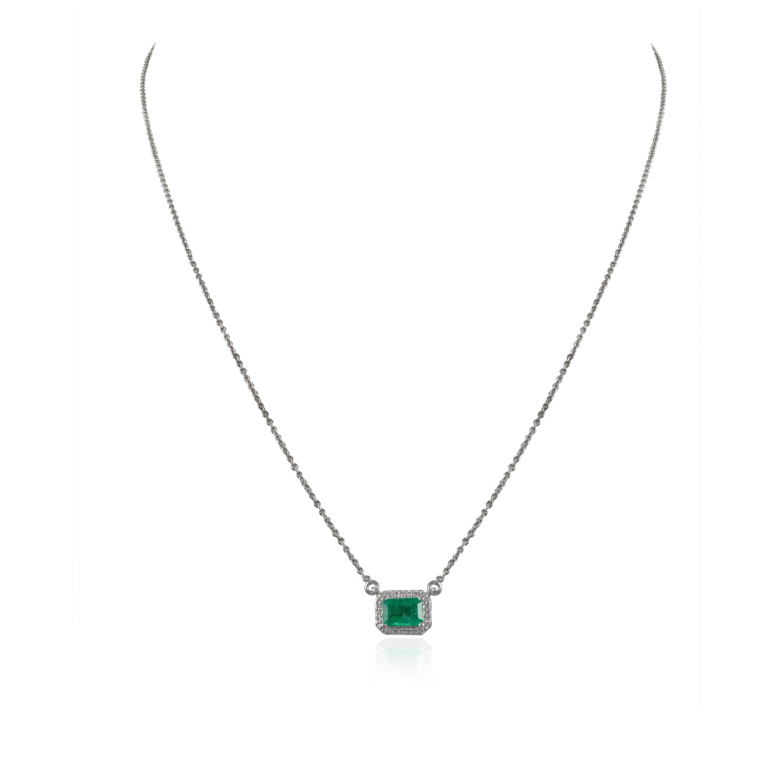 Surrounding the emerald is a dazzling halo of diamonds, totaling 0.05 carats. Each diamond, measuring 1 mm, is meticulously set in a prong setting to enhance their natural brilliance and add a touch of sparkle to the necklace. The combination of the vibrant emerald and the sparkling diamond halo creates a stunning contrast that exudes sophistication and charm.