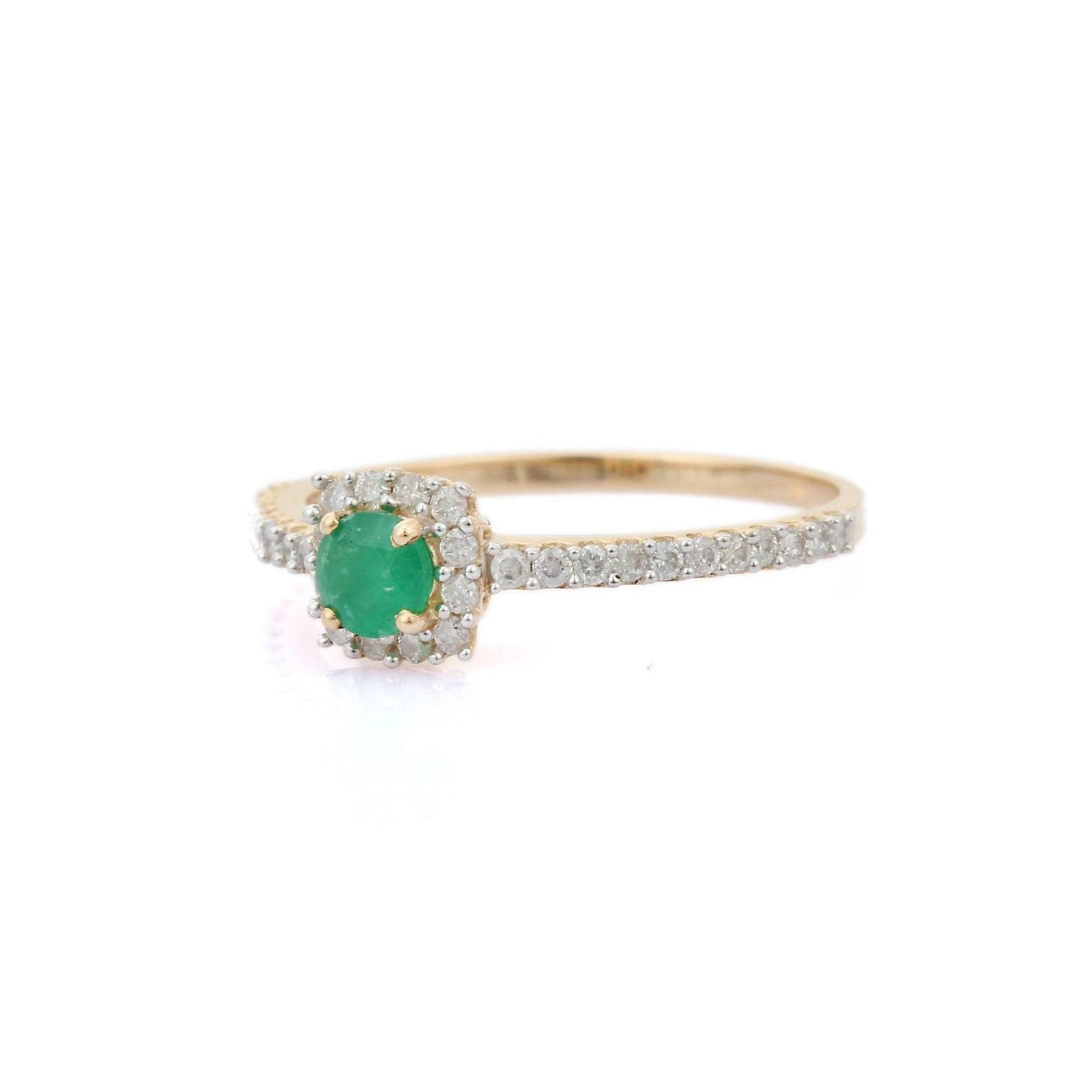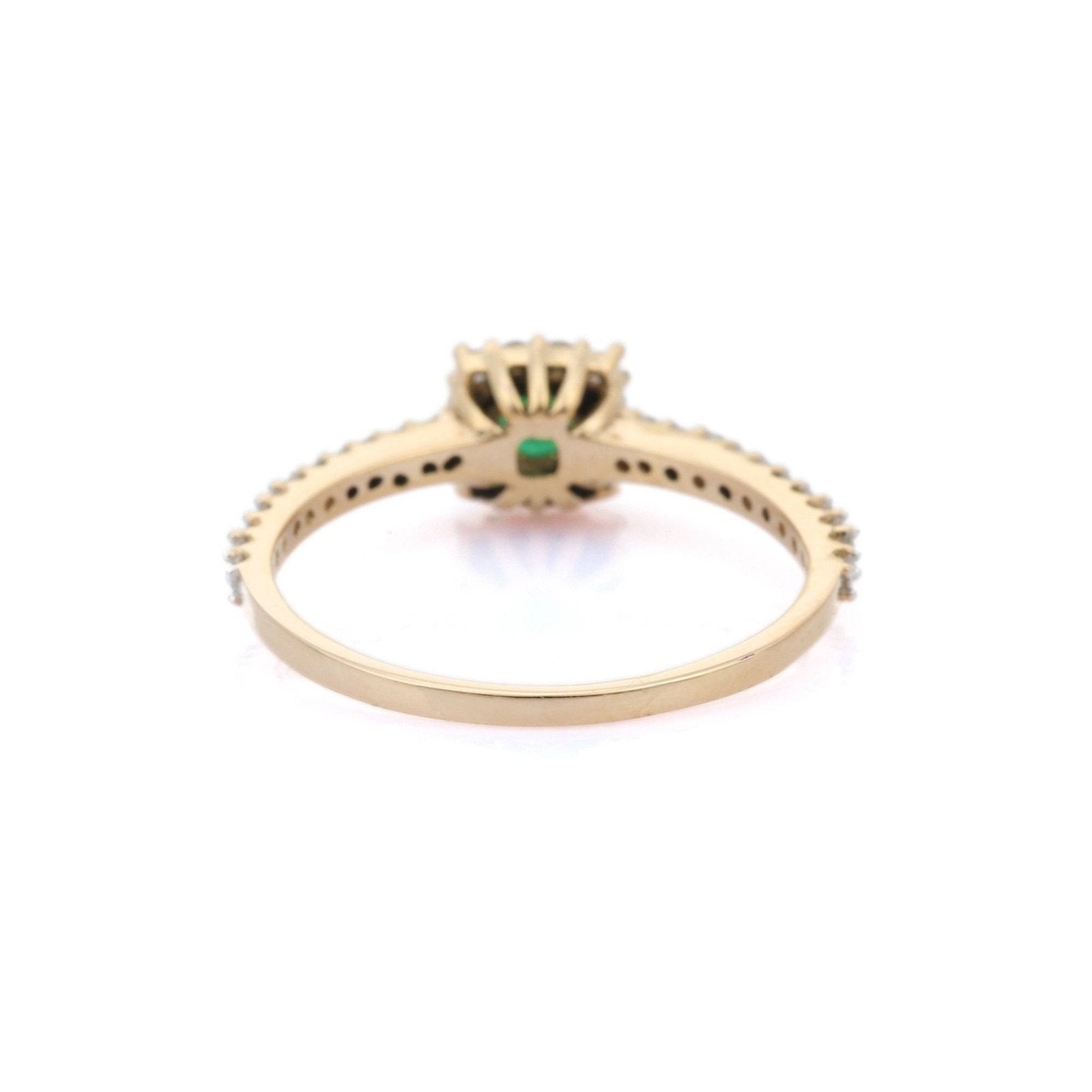 The emerald exhibits a vibrant green hue and excellent clarity, secured in place by delicate prong settings that enhance its natural brilliance. Surrounding the emerald are 32 dazzling diamonds, totaling 0.29 carats, meticulously set in a prong setting along the band.