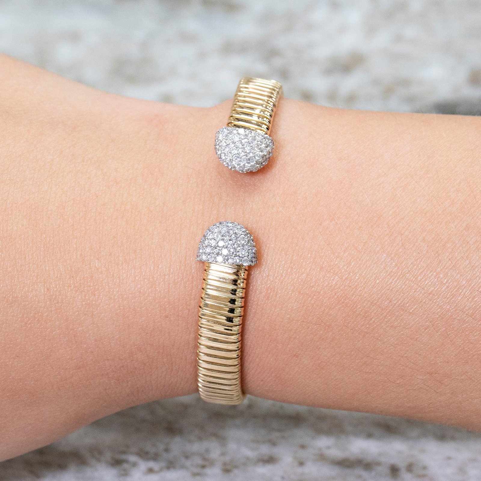 The round ends with pave diamonds add a touch of contemporary elegance to the bangle, making it a versatile piece that can elevate any outfit. Whether you’re dressing up for a formal event or looking to add a touch of sophistication to your casual attire, this bangle is the perfect choice. Its flexible design also makes it easy to wear and style, either as a standalone statement piece or layered with other bracelets for a more personalized look.