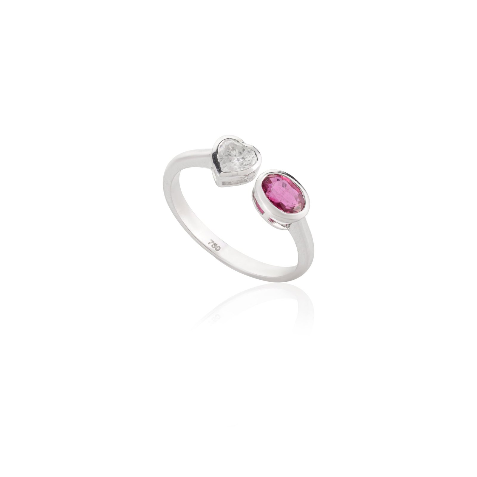 Accentuating the ruby is a dazzling heart-shaped diamond, totaling 0.31 carats. The diamond, measuring 4 x 4.5 mm, is meticulously set in a bezel setting to enhance its natural brilliance and add a touch of sparkle to the ring. The combination of the vibrant ruby and the sparkling heart-shaped diamond creates a stunning contrast that exudes sophistication and charm.