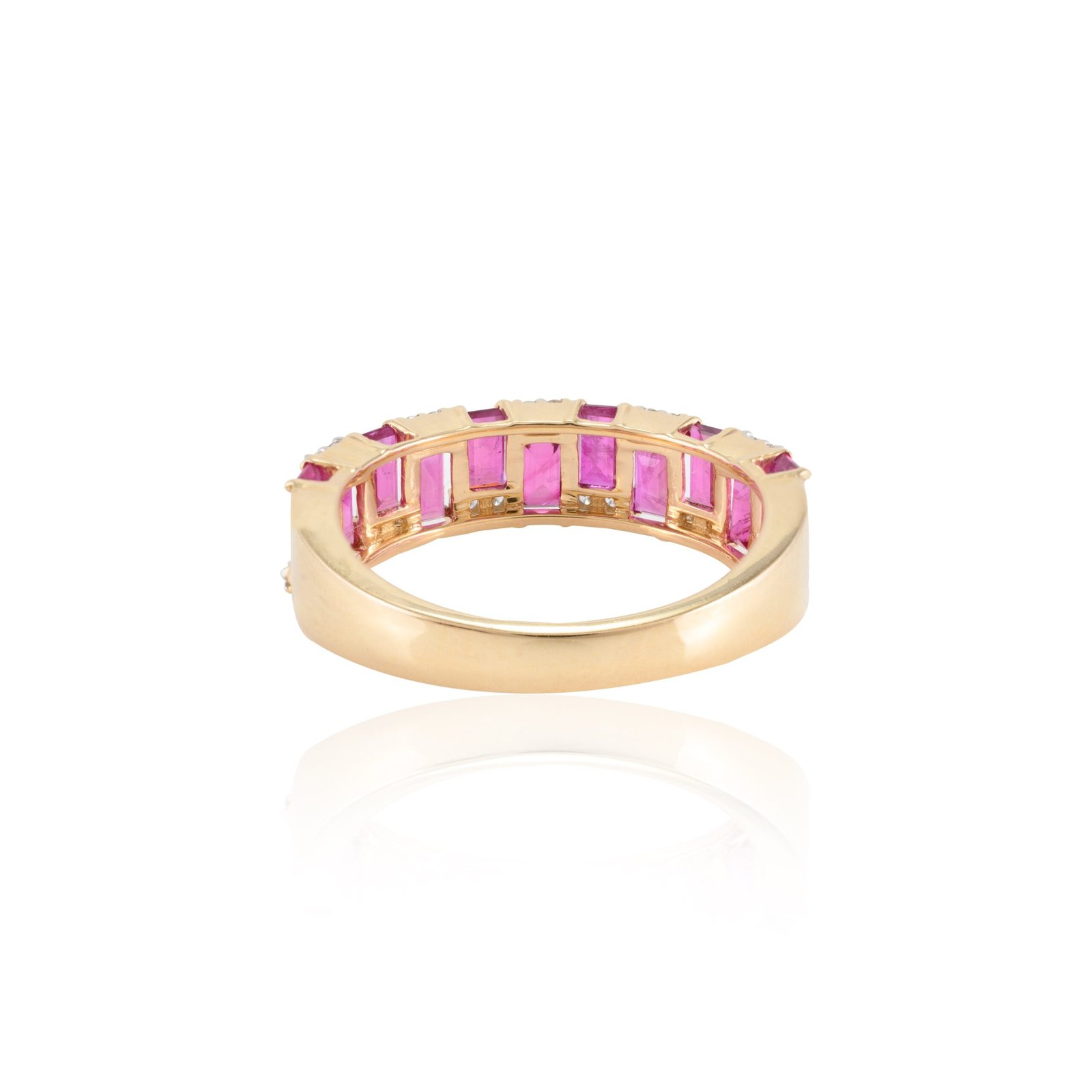 Accentuating the rubies are twenty-two dazzling diamonds, totaling 0.13 carats. Each diamond, measuring 1.3 mm, is meticulously set in a prong and channel setting to enhance their natural brilliance and add a touch of sparkle to the band. The combination of the vibrant rubies and the sparkling diamonds creates a stunning contrast that exudes sophistication and charm.