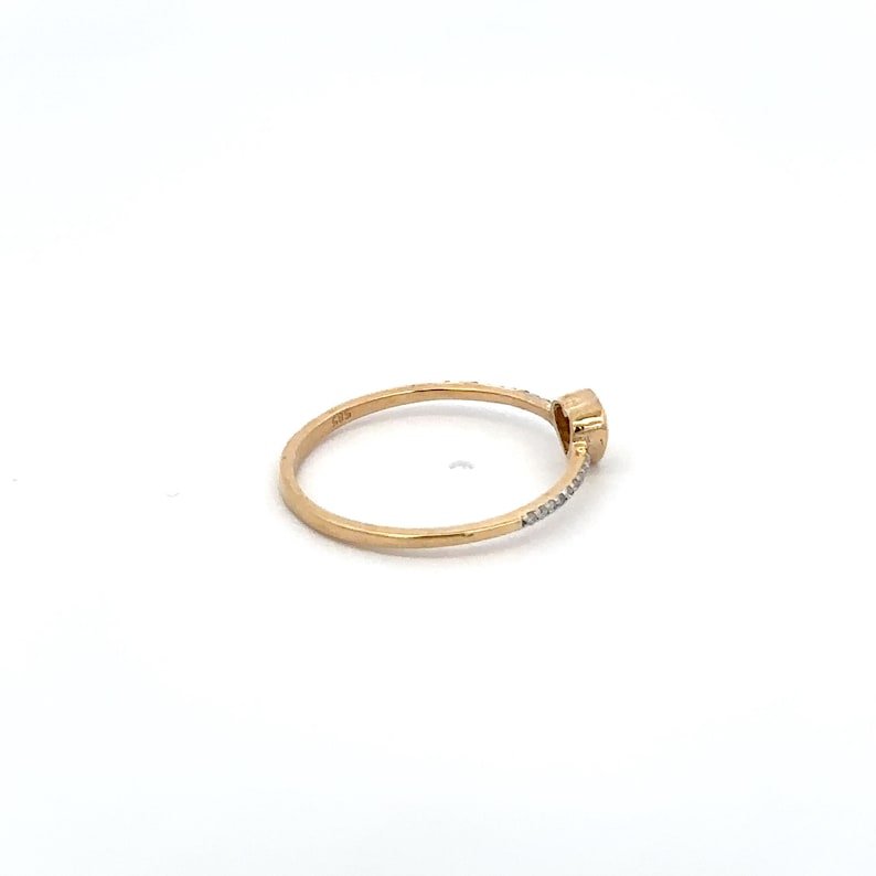 Adding to the elegance, this ring is adorned with diamonds totaling 0.05 carats. The diamonds, each measuring 1 mm, are set in a sophisticated prong setting that enhances their natural brilliance. This design allows their vivid sparkle to shine through, creating a captivating effect that elevates the overall appeal of the ring.