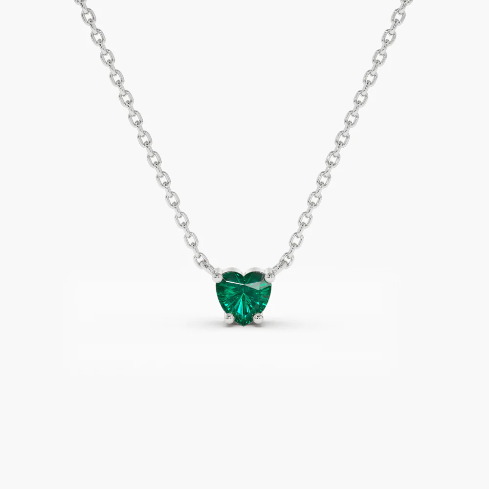 Set in a classic three-prong or bezel setting (based on design), the emerald pendant floats delicately from a fine cable chain, allowing it to sit gracefully at the collarbone. The heart shape adds a touch of softness and sentiment, making it an ideal gift for anniversaries, birthdays, or meaningful milestones. Whether worn alone for understated elegance or layered with other dainty chains, this necklace adds a romantic charm to any outfit.