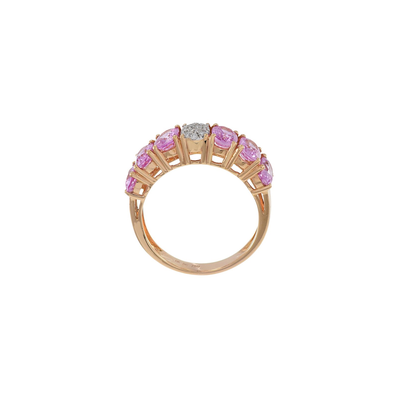 This gorgeous ring boasts bright pink sapphires that weigh 2.58 carats. Each sapphire has been handpicked for its unique color and brilliance. Striking sapphires are beautifully enhanced by the delicacy of diamonds weighing 0.07 carats. Diamonds add sparkle and make the ring look more alluring. Pink sapphires and sparkling diamonds create an excellent contrast to the eye and add sophistication.
