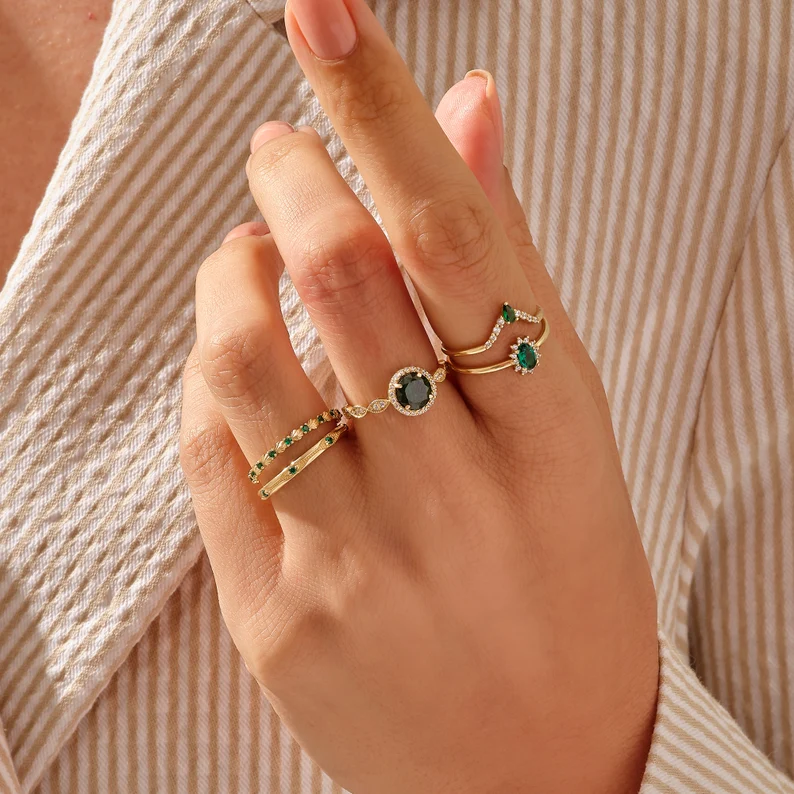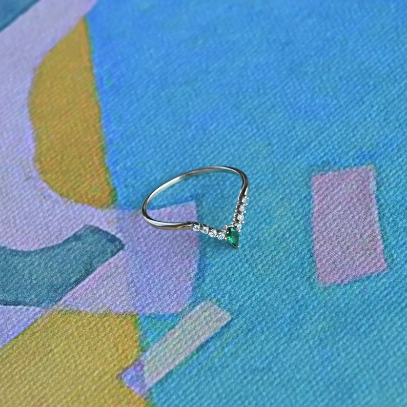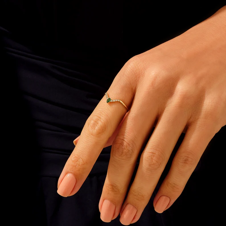 Delicate 14K solid gold ring featuring a graceful curve adorned with vibrant emeralds—crafted for modern elegance and everyday sophistication.