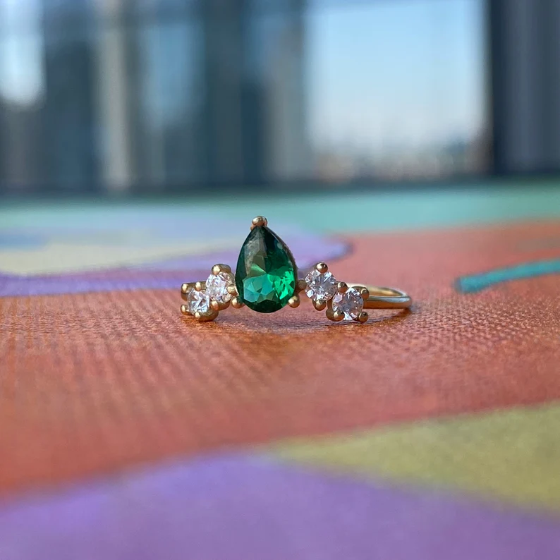 14K Solid Gold Pear Emerald Anniversary Ring