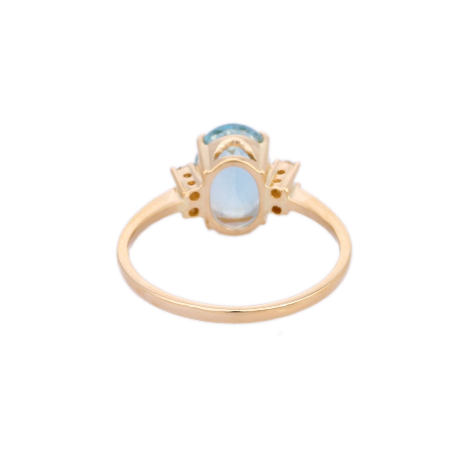 Surrounding the aquamarine are four sparkling diamonds, with a combined weight of 0.06 carats. These diamonds are carefully set to enhance the overall brilliance of the ring, adding a touch of subtle sparkle that complements the serene color of the aquamarine. The diamonds’ delicate shimmer provides a perfect contrast to the gemstone’s tranquil hue.