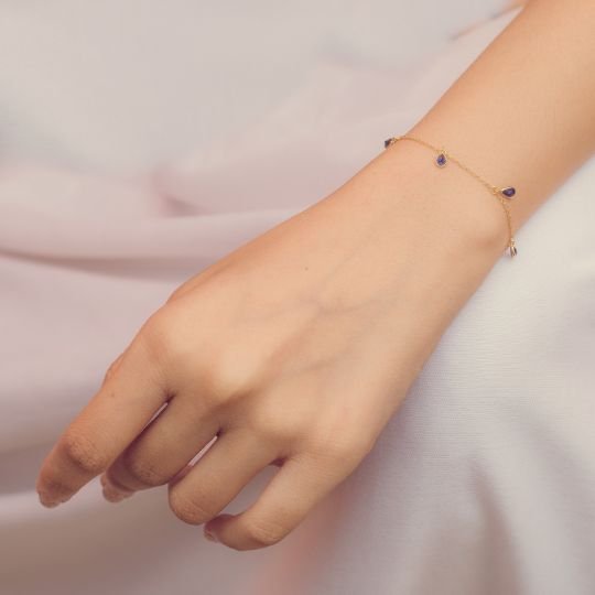 Delicate 14K solid gold charm bracelet adorned with deep blue sapphires. A timeless piece adding sparkle and elegance to your everyday style.