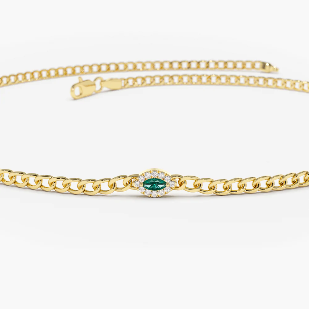 18k Solid Gold 2MM Curb Link Marquise Emerald Bracelet