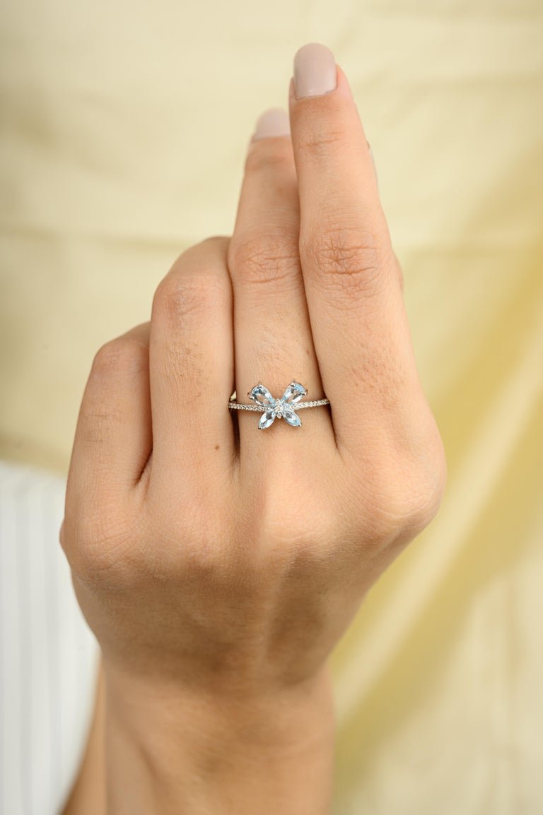 Crafted from luxurious 18k solid gold, this ring features a whimsical butterfly design adorned with aquamarine and diamond gemstones. The ring showcases pear-shaped aquamarines with a total weight of 0.56 carats, with sizes measuring 4.7×2 mm and 5×3 mm. These serene blue gemstones are complemented by sparkling diamonds totaling 0.06 carats, with a diamond size of 0.6 mm.