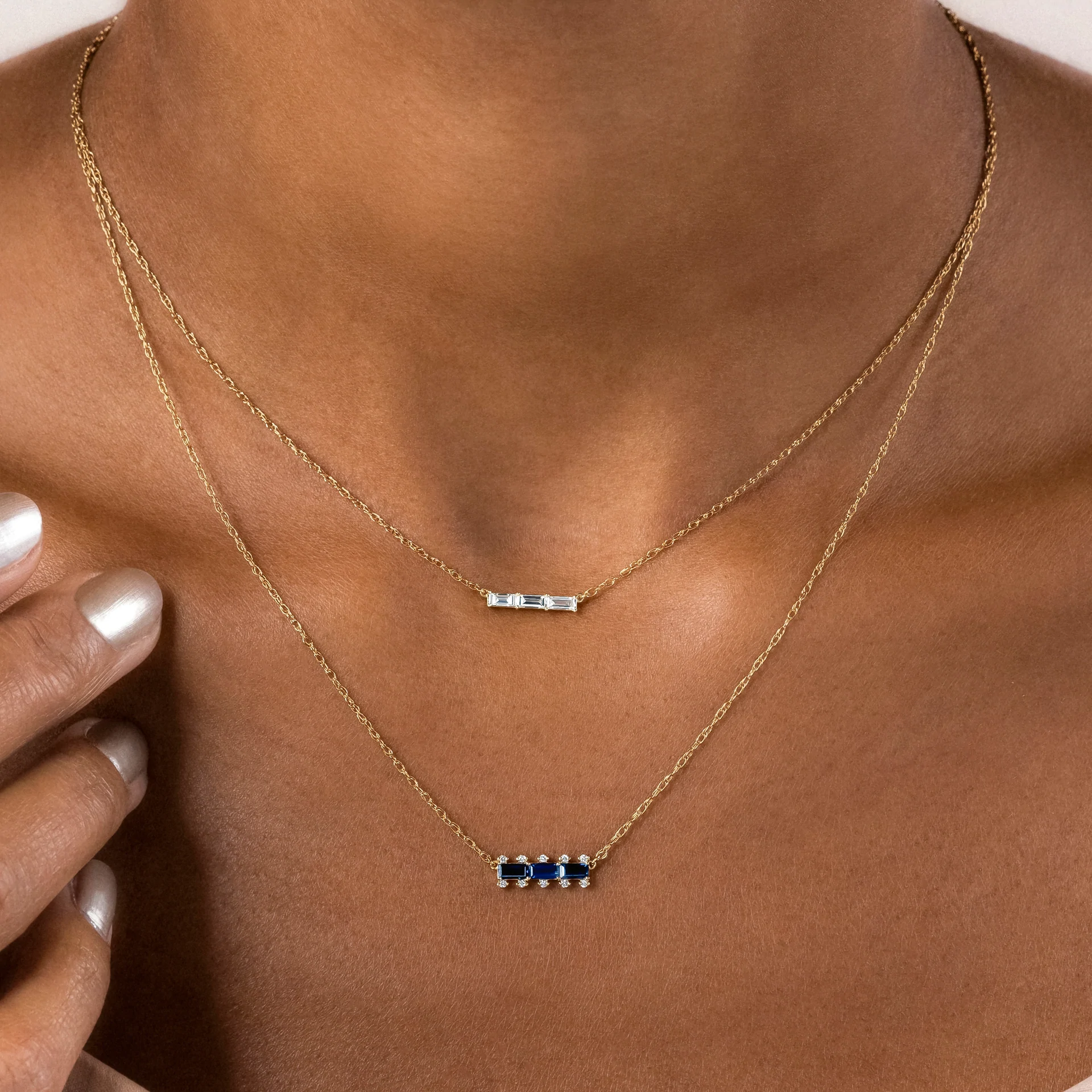 Elegant 18k solid gold bookend necklace featuring deep blue sapphires—crafted for modern minimalism, vibrant color, and timeless sophistication.
