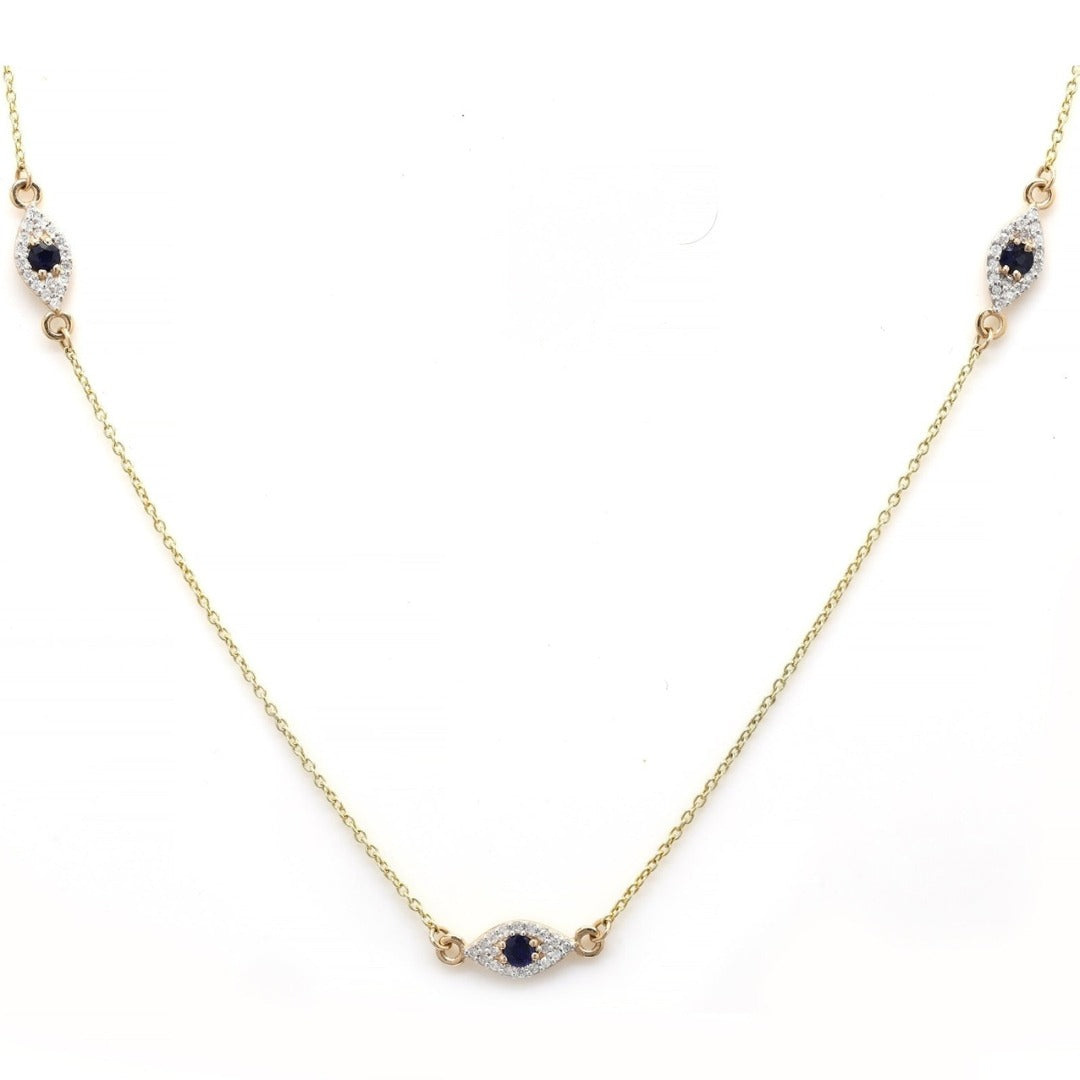 At the heart of this necklace are three stunning blue sapphires, each measuring 2.5 mm and collectively weighing 0.23 carats. These sapphires are renowned for their deep, captivating blue hue and are expertly set in prongs to maximize their brilliance and sparkle. The sapphires are strategically placed to form the centerpiece of the evil eye design, adding a touch of elegance and mystique.